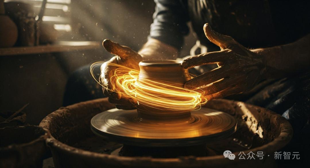特写镜头下,工匠的双手在陶轮上塑造着一件泛着光泽的陶器。金色的光芒如丝如缕,连接着陶艺师的手与黏土,随着动作优雅流转。工作室内充满丰富的质感——布满工具的尘旧架子、散落的陶土碎片,以及透过木制百叶窗洒落的自然光束。光线与能量的交织营造出一种空灵、近乎魔幻的氛围