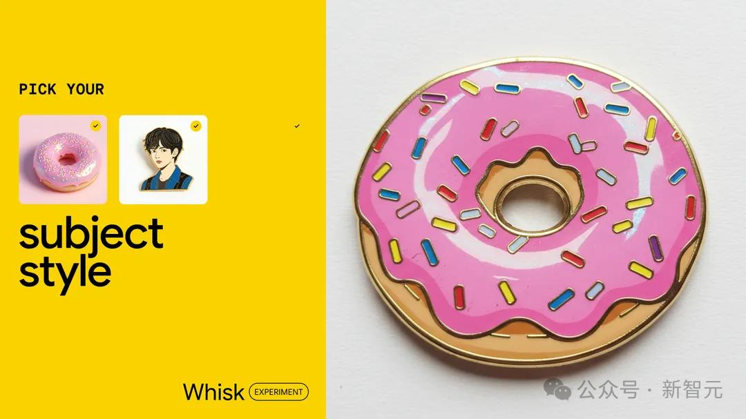 在Whisk中,我们可以通过上传图片,来定义主体、场景和风格,然后将它们重新混合,创造出自己独特的作品,比如数字玩偶、珐琅徽章、精美贴纸。