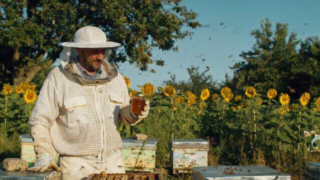 镜头如清风般轻柔地穿梭在粉彩色的木制蜂箱之间,勤劳的蜜蜂翩翩起舞,时隐时现于画框之中。画面缓缓停驻在场景中央那位气质优雅的养蜂人身上,他身着的洁白养蜂服在金色的午后阳光中熠熠生辉。他轻抬着一罐琥珀色的蜂蜜,略微倾斜着让阳光透过蜜液折射出温暖的光晕。在他身后,一片高大的向日葵随着微风轻轻摇曳,金黄的花瓣在温暖的阳光照耀下绽放出柔和的光芒。镜头徐徐上移,展现出一座典雅的乡村老宅,薄荷绿色的百叶窗点缀其间,摇曳的树影在墙面上织就出斑驳的光影图案。这组照片采用35毫米镜头搭配柯达Portra 400胶片摄制,浸润在金色光线中的每一个细节——养蜂人的手套、晶莹的蜂蜜罐、饱经岁月的蜂箱木纹,都呈现出丰富而细腻的质感层次