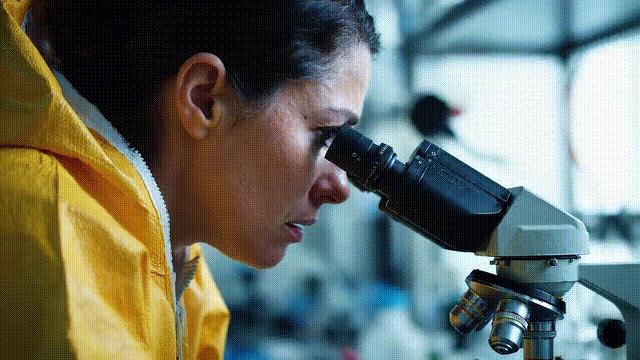 富有电影感的镜头捕捉了一位身着暗黄色生化防护服的女医生,实验室惨白的荧光灯将她的身影笼罩其中。镜头缓缓推进她的面部特写,细腻的横向推移突显出她眉宇间深深刻画的忧思与焦虑。她专注地俯身于实验台前,目不转睛地透过显微镜观察,手套包裹的双手正谨慎地微调着焦距。整个场景笼罩在压抑的色调之中,防护服呈现出令人不安的黄色,与实验室冰冷的不锈钢器械相互映衬,无声地诉说着事态的严峻和未知的威胁。景深精确控制下,镜头对准她眼中流露的恐惧,完美传达出她肩负的重大压力与责任