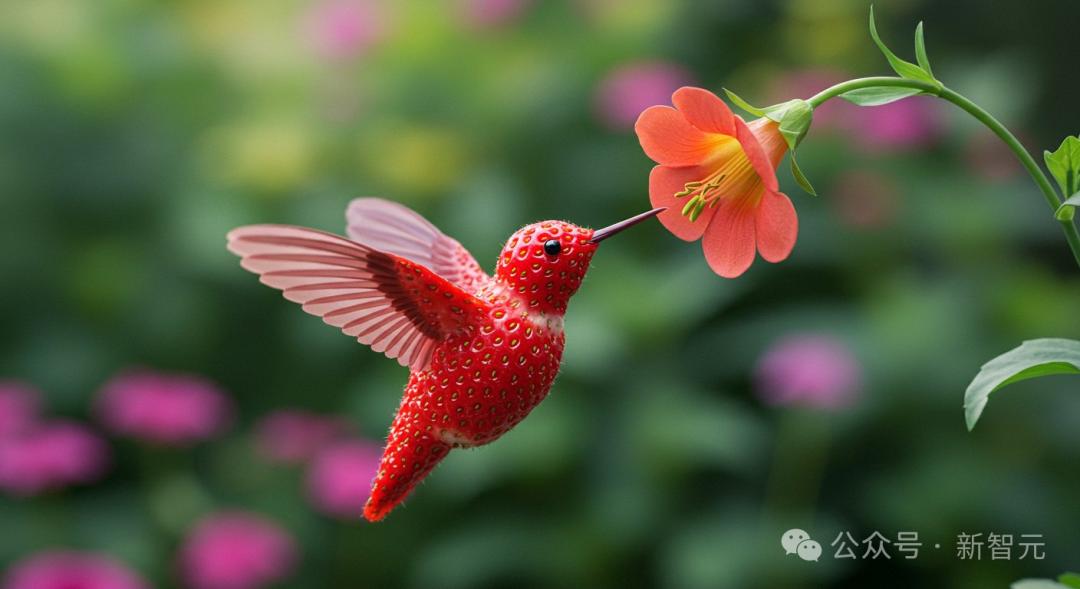 超现实的场景,Imagen 3也能精准把握,比如下面这只草莓蜂鸟。整个图像呈现出高分辨率的专业摄影手法,景深控制让蜂鸟和花在虚化的背景中更显生动。