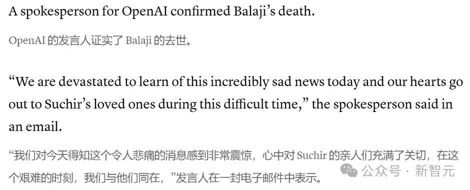 目前,OpenAI的发言人已经证实了Balaji的离世,并在邮件中表达了沉痛的哀悼。