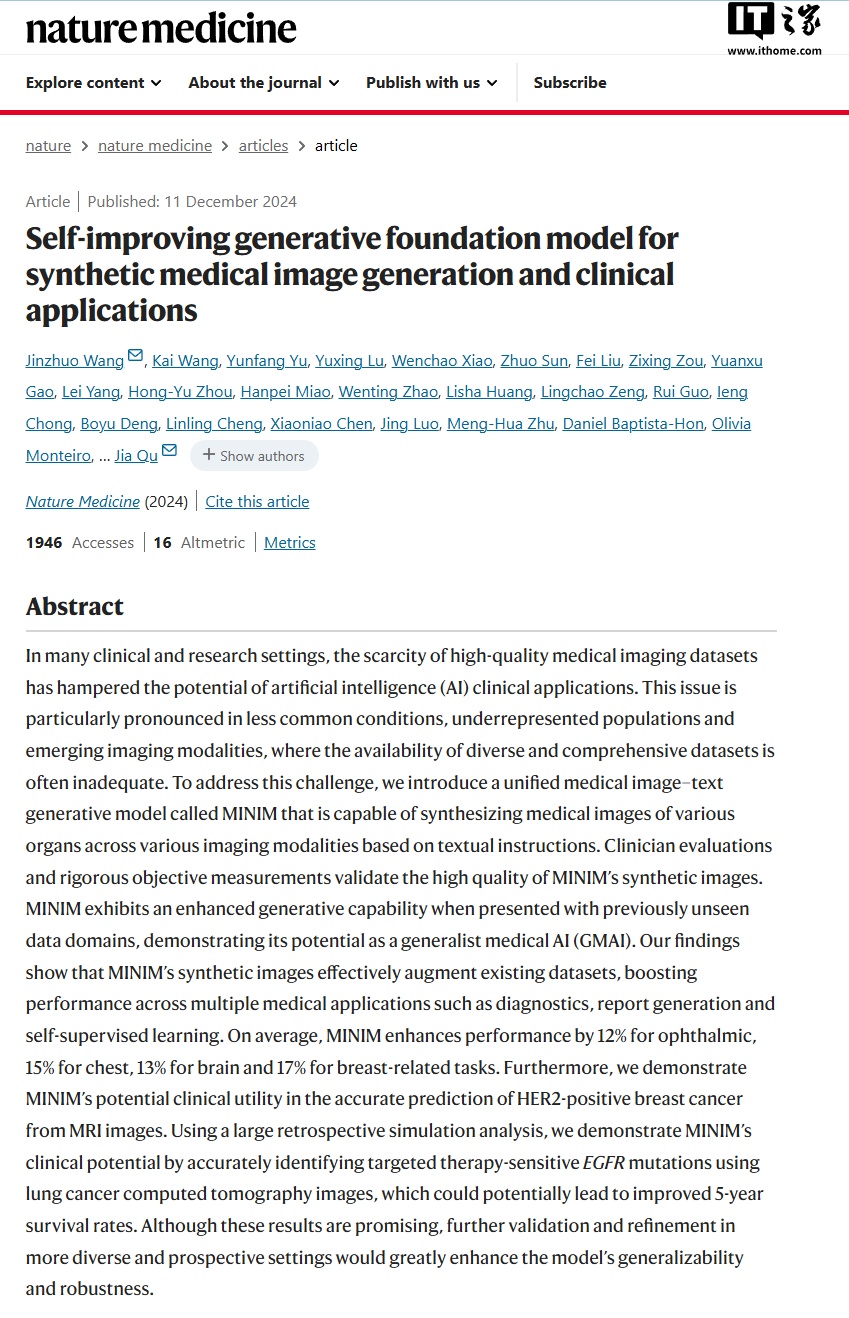 该成果已于 12 月 11 日发表在国际权威期刊《自然・医学》上(IT之家附 DOI:10.1038 / s41591-024-03359-y)。