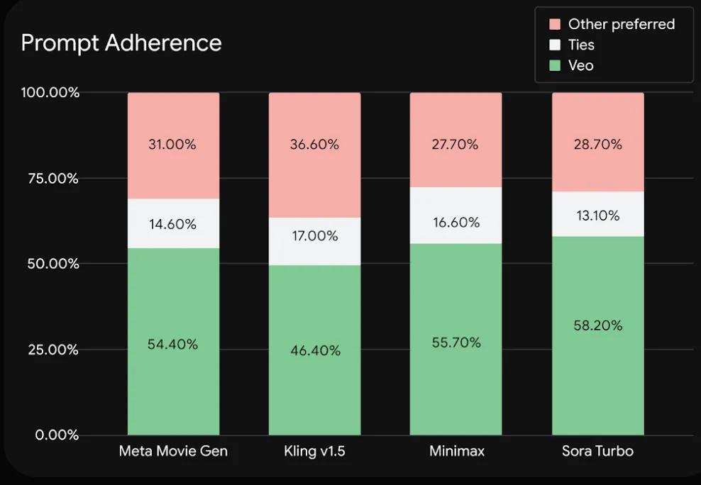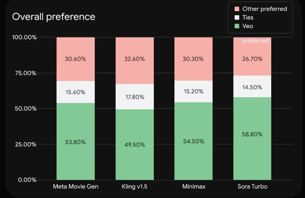 从整体表现上看,Veo占优的情况都接近或超过了50%,不占劣势的情况则能达到70%左右。