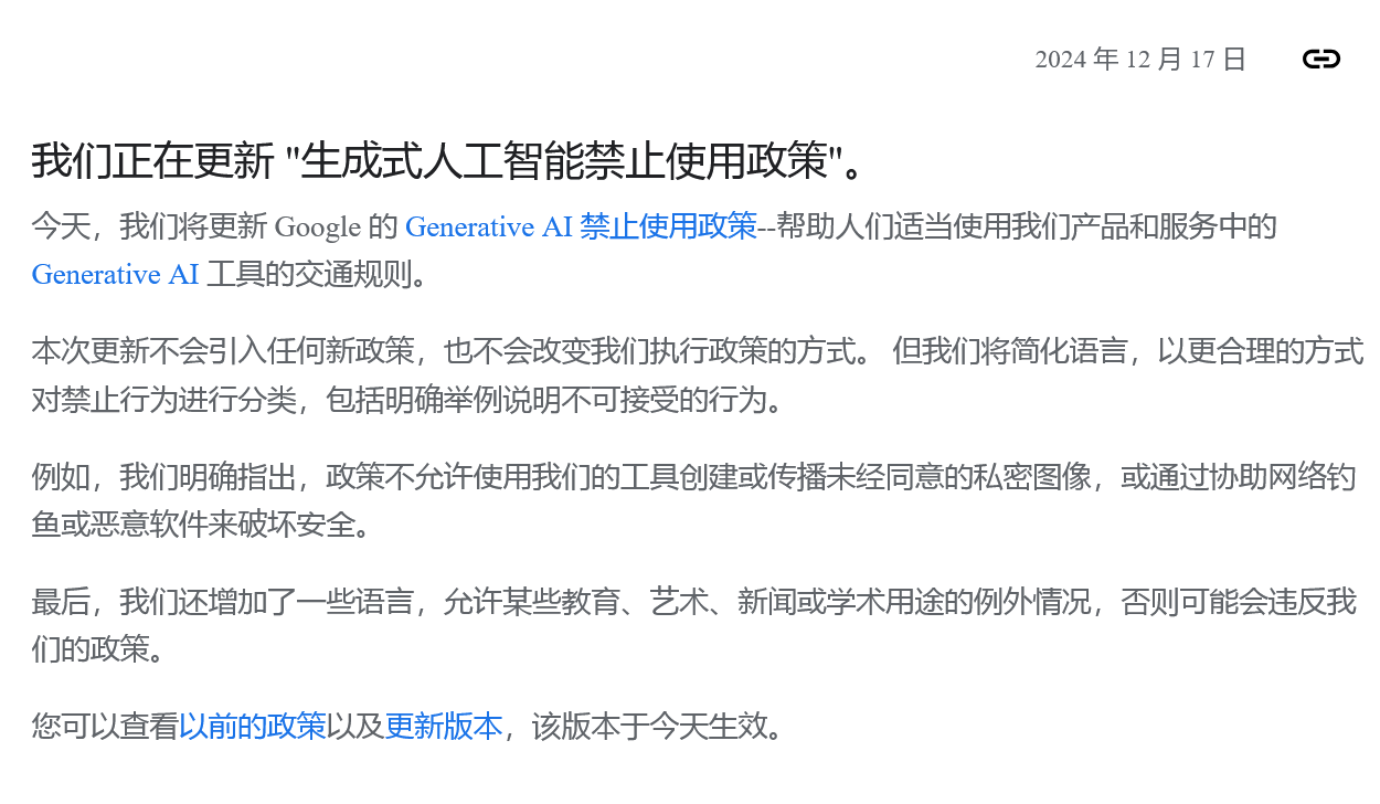 Google发言人在通过电子邮件接受采访时说:"对于所有高风险领域,我们的政策中一直都有人工监管的要求。[我们]正在对[我们条款中的]一些项目进行重新分类,并更明确地指出一些例子,以便让用户更清楚地了解。"