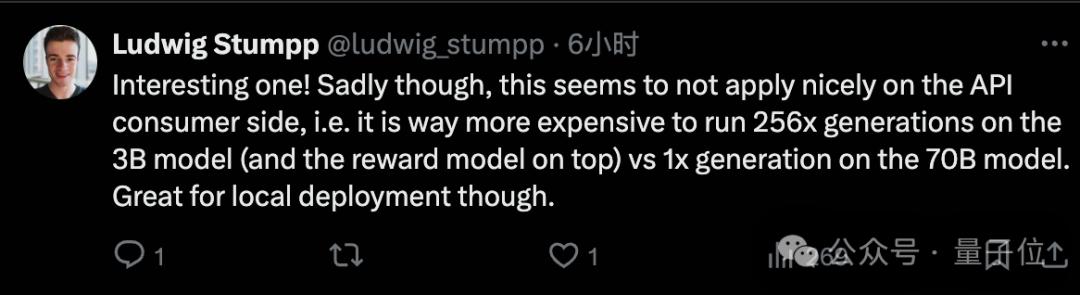 评论区有网友表示,这种方法更适合本地部署,而不是API调用,因为调用256次3B模型和过程奖励模型,通常会比调用一次70B模型更贵。