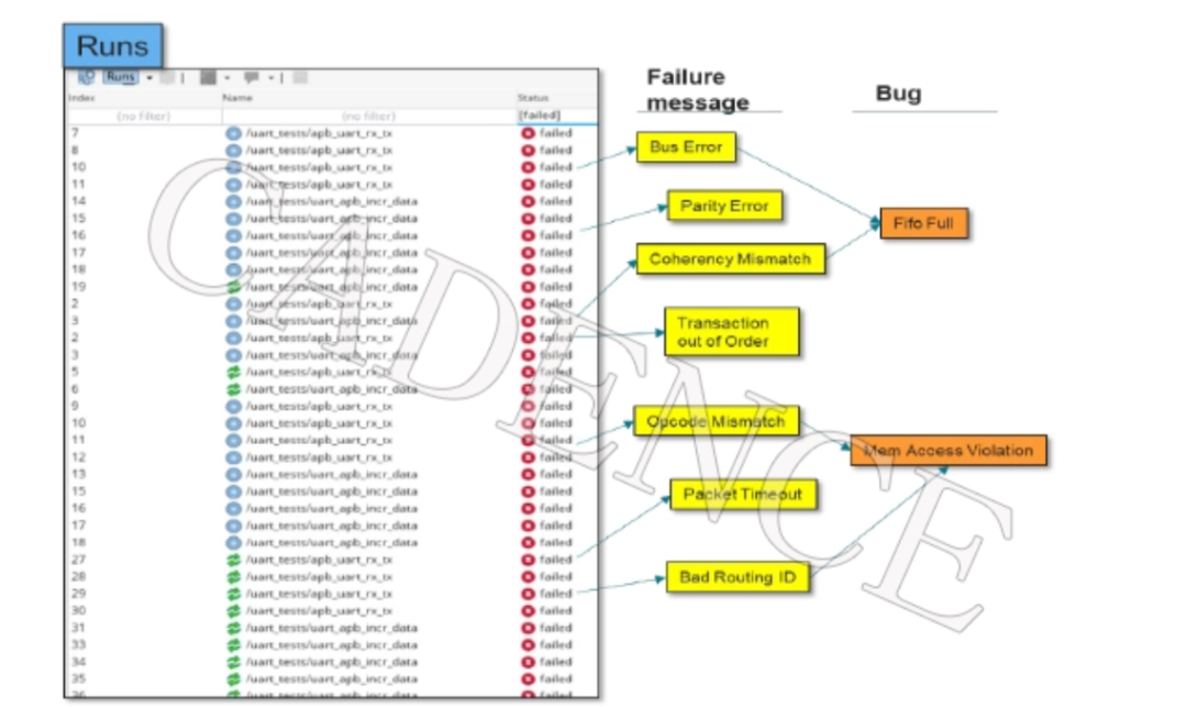 在回归测试完成后,首先使用 Verisium AutoTriage 进行故障分类。手动分析故障成本高昂且效率低下,其中的一大原因是不同的故障容易被归类至类似的组别中。例如,内存访问冲突问题就可能导致多个不同的测试失败。而 AutoTriage 可以通过分析由共有问题导致的失败测试来创建故障集群列表——这些共有问题可能是基于发送错误消息、测试名称以及发生故障的运行时间等多种因素。然后识别这些故障间的共同线索,从而助力工程师快速找到故障的根本原因。