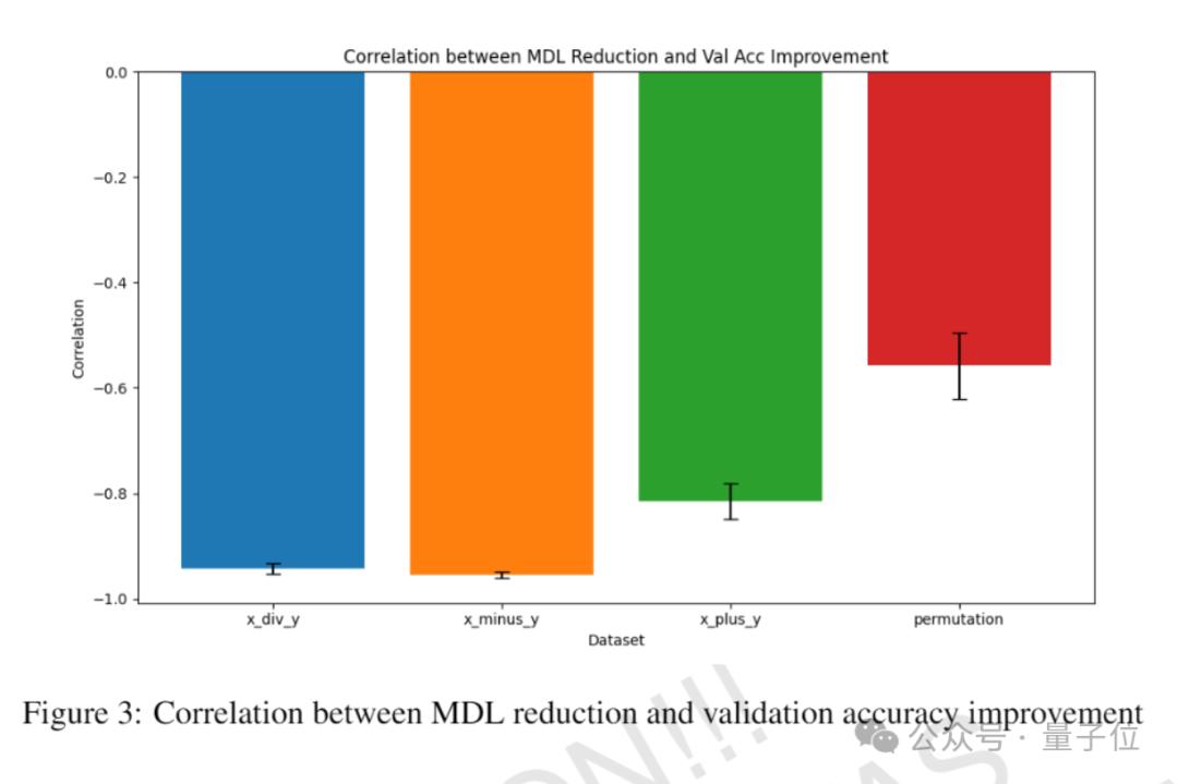 此外,研究观察到在“grokking”与非“grokking”情境下MDL演变模式的差异,前者以快速的MDL减少后持续泛化为特征。这些发现为理解“grokking”的信息论基础提供了见解,并表明在训练期间监控MDL可以预测即将发生的泛化。