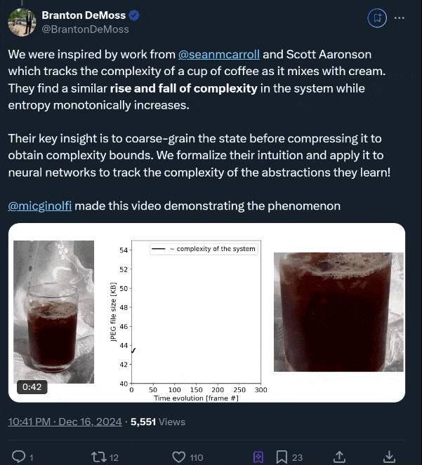 通过观察咖啡与奶油混合的现象,Scott等人发现复杂性随着时间的推移首先上升,然后下降,这一过程与熵单调增加的趋势相似。