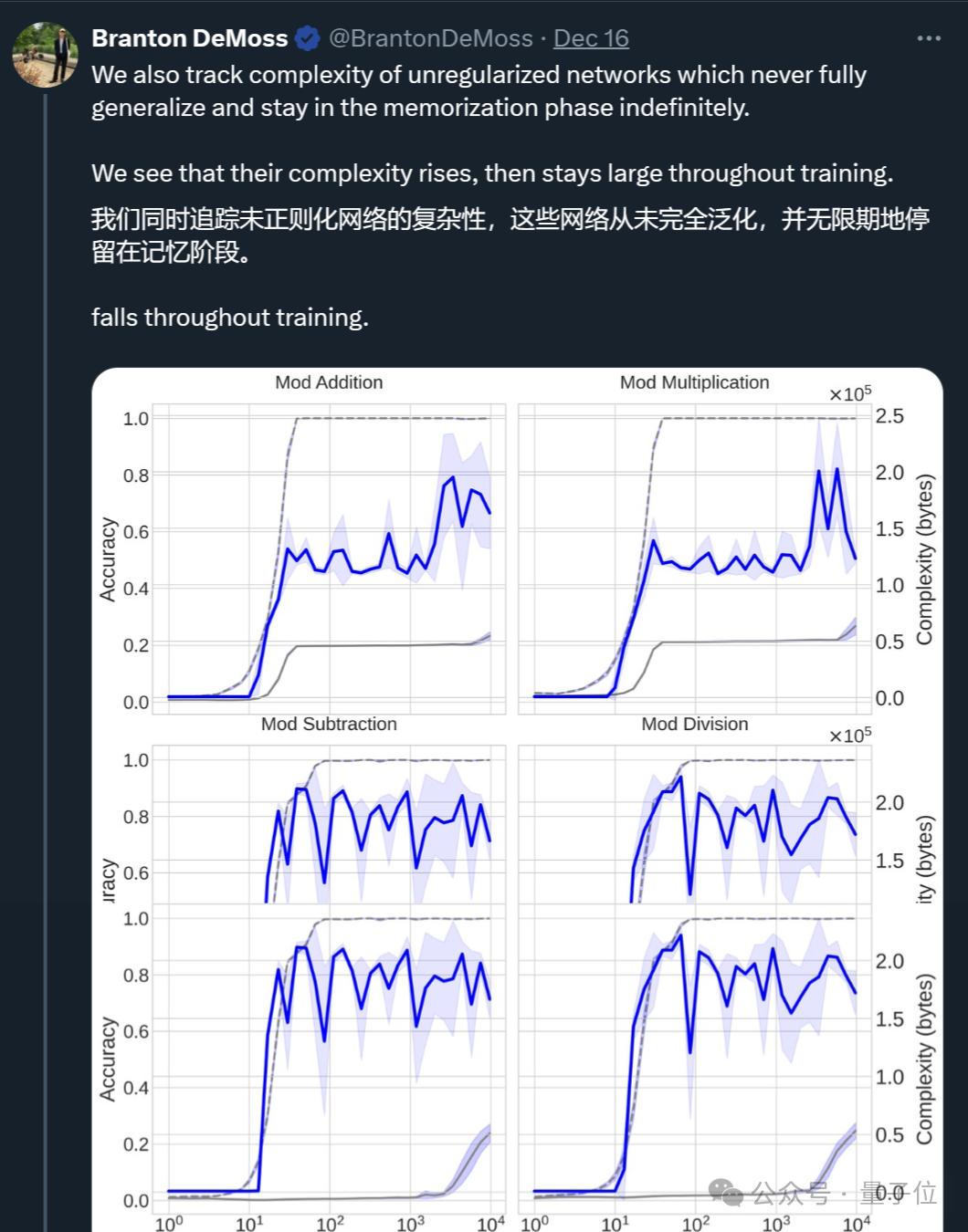 为了解释这一现象,团队引入了一种基于失真压缩和Kolmogorov复杂性的新方法来衡量神经网络的复杂性,并通过这一框架追踪了grokking过程中网络复杂性的动态变化。