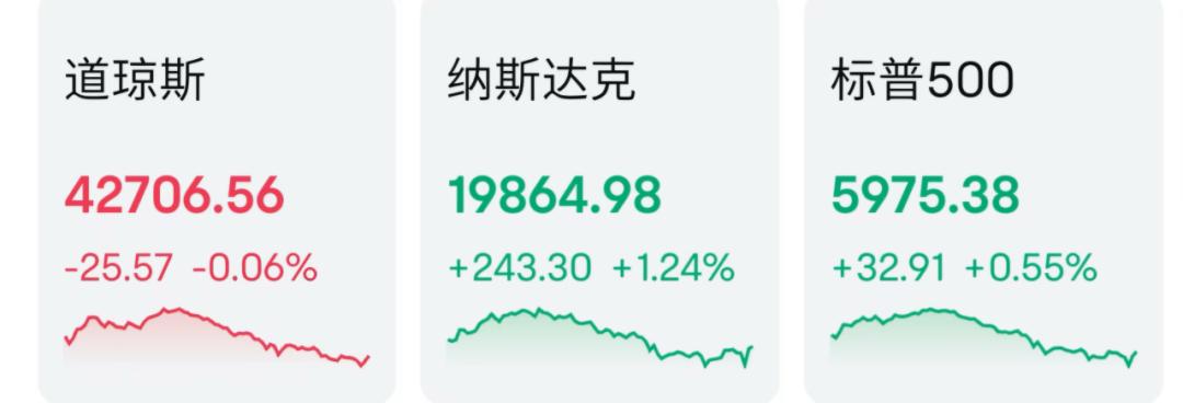 最终,道指微跌0.06%,纳指上涨1.24%,标普500上涨0.55%。