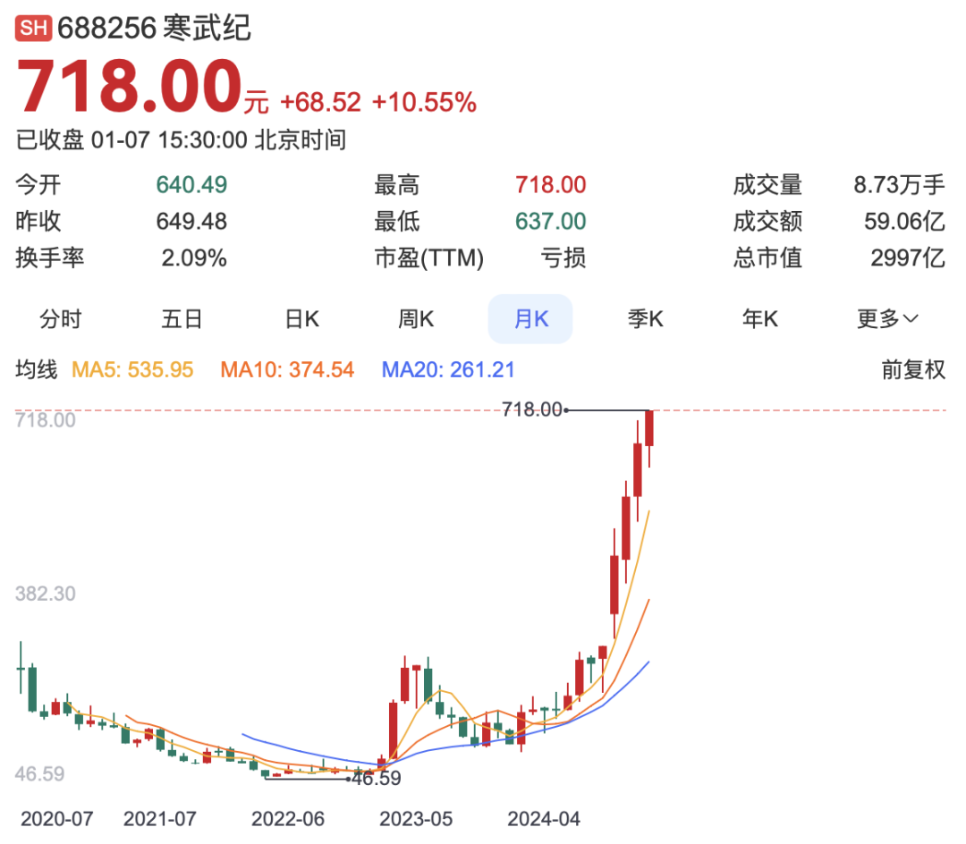 仅仅2年时间,寒武纪股价上涨了14倍。2024年以来,寒武纪股价也上涨了5倍。