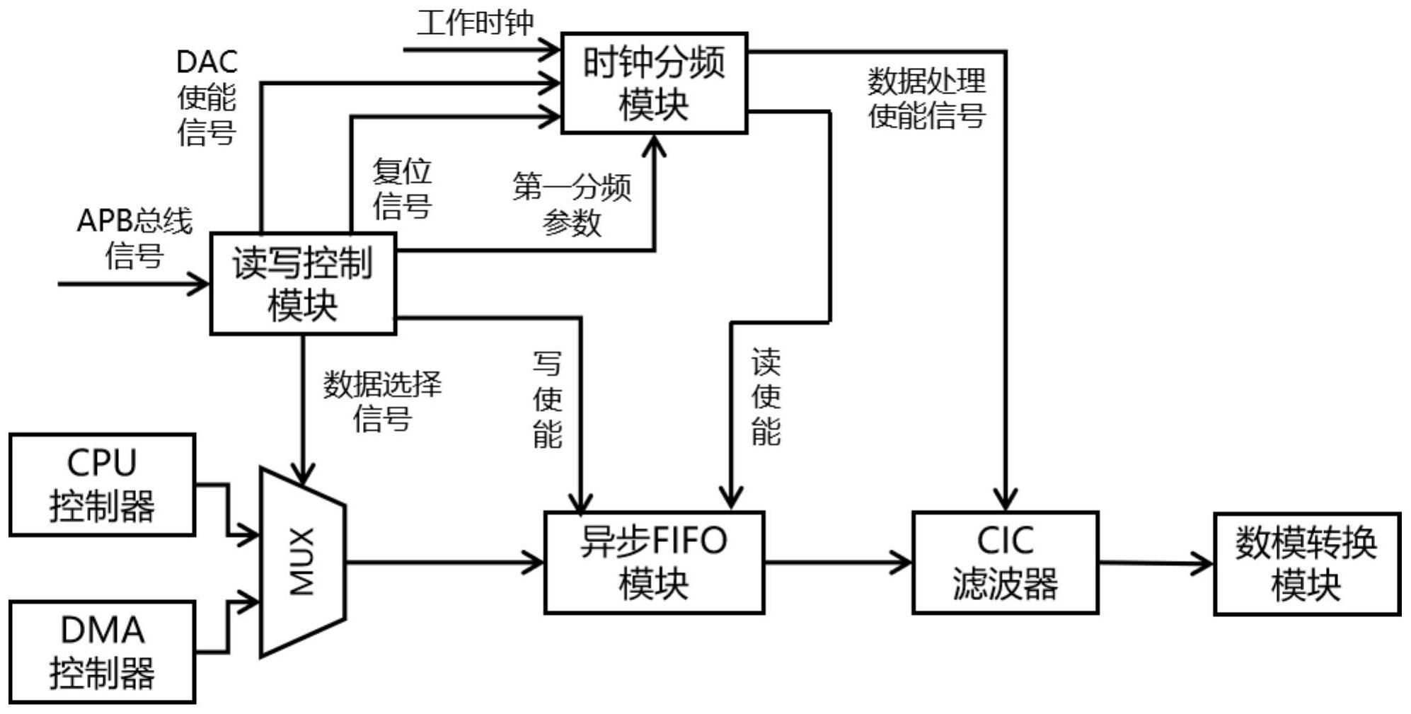 本发明公开了一种音频数模转换电路,所述电路采用新的音频DAC架构,优化了传统架构中大量乘加运算、组合逻辑和寄存器,大大减小了硬件面积和设计复杂度;同时,解决了对音频DAC电路工作时钟频率严格要求的限制,并且可以支持不同采样率的音频,应用和设计上更灵活。