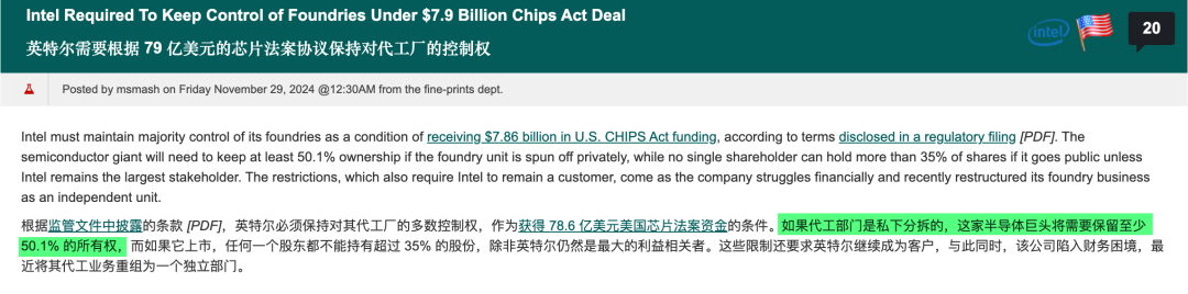 首先是芯片代工业务这块,之前英子拿补贴的时候,跟美国商务部达成过一个附加条件,那就是即便拆分芯片代工业务,英子也要保留 50.1% 的股权,维持控制权。