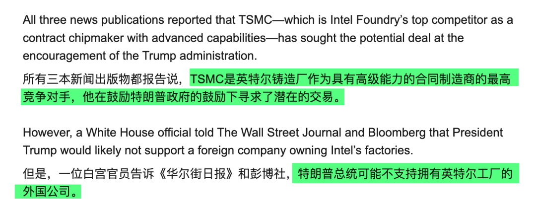 但台积电和英特尔达成交易又有点不太可能,因为特朗普可能不支持外国企业拥有英特尔的工厂。