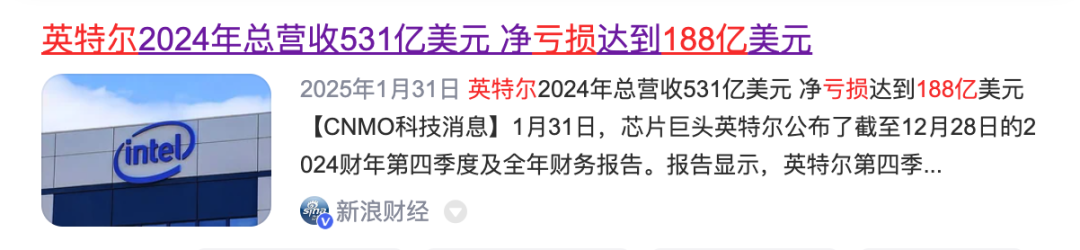是这么回事儿,你们可能不知道英特尔过去一年到底亏了多少钱。过去的 2024 财年里,英子的净亏损是 188 亿美元,相比而言, 2023 财年英子还能净赚 17 亿美元。