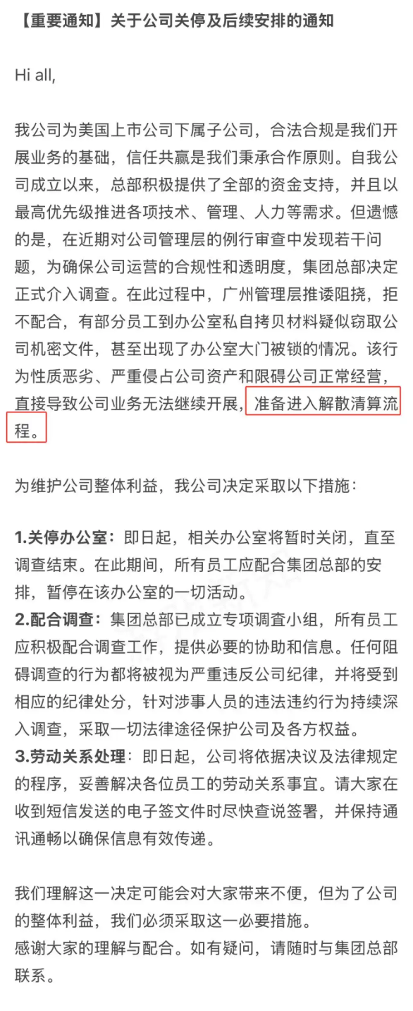 关于停工原因,报道称,图森未来近期在对管理层的例行审查中发现若干问题,为确保公司运营的合规性和透明度,集团总部决定正式介入调查。而在调查过程中,广州管理层阻挠且拒不配合,“甚至出现了员工私自拷贝材料疑似窃取公司机密文件及办公室大门被锁的情况”,因此总部决定广州部门进入解散清算流程。