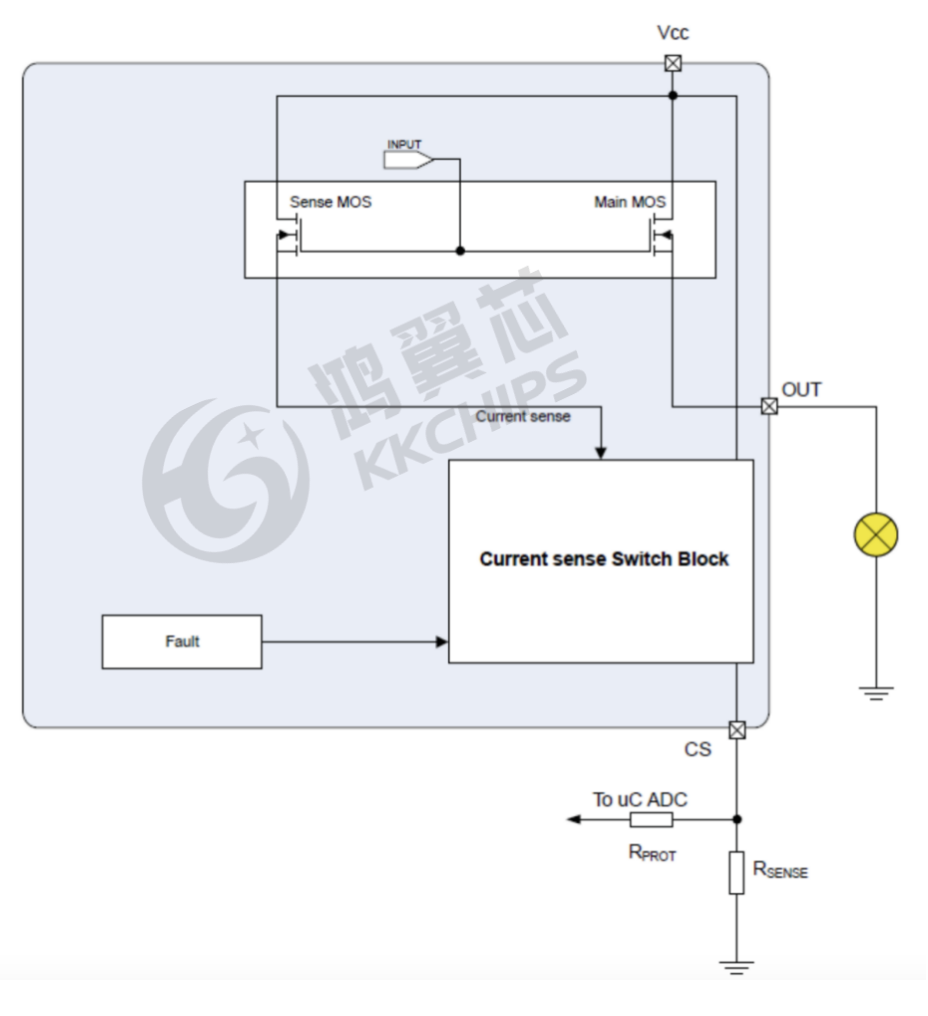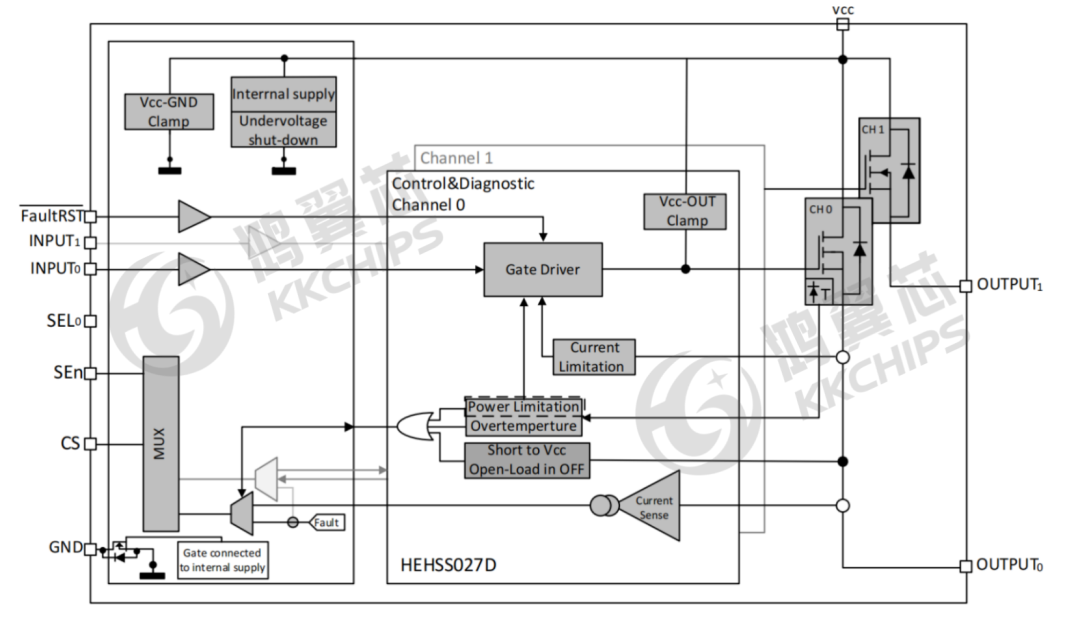HEHSS027D 内部集成了Power MOS+驱动电路+保护与诊断功能,通过在Power MOS内部嵌入温度和电流传感器,可以更准确的监控芯片的温度和与温度,实现精确的限流、过温和过流保护,VIPower工艺大幅提升了芯片的电流采样系数K值的稳定性。