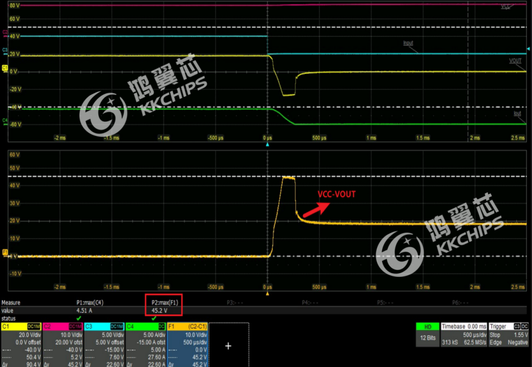 在感性负载(如电机、电磁阀等)关闭时,由于电感的储能特性,电流无法瞬间中断,会产生振荡电流,振荡电流会拉低OUT端电压。为保护芯片免于损坏,需要Vdemag(VCC-OUT Clamp)反向钳位保护,防止OUT端电压被拉的过低;同时,为防止VCC端电压在特殊情况下冲高,超过耐压极限,还需要正向钳位保护Vclamp(typical 46V),电压钳位功能将电压限制在某一值,实现电感能量正常耗散而不损坏器件。