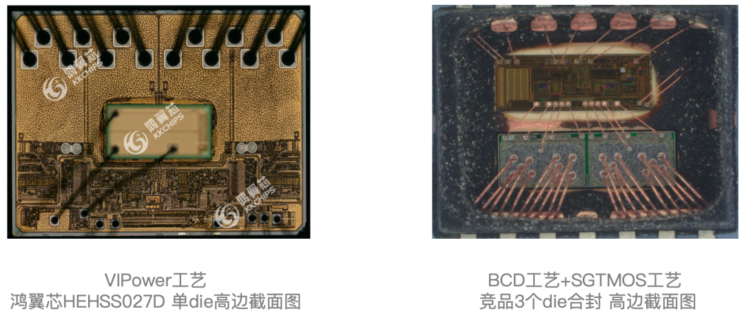 HEHSS027D 实现了领先的单晶圆集成方案,通过P burried layer隔离,将平面工艺和垂直工艺集成在同一个die上,区别于传统国产高边芯片的多die分离集成,可大幅减少寄生电容、电阻影响,提高芯片集成度和可靠性,提高晶圆、封测质量管控的可控性,同时在抗信号干扰(高速信号、电源噪声、EMC等)能力上更优。