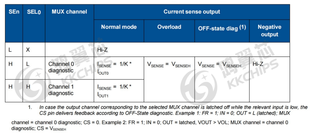 在发生过载或在off-state状态下(off-state下可进行short-to-VCC和 open load诊断),故障报错由CS引脚反馈,此时,将CS引脚的电压拉高至“故障”电压源VSENSEH。SEL0引脚可根据每种工作模式定义的多路复用器地址码(multiplexer addressing)的特定配置,定位通道故障状态及触发保护功能。