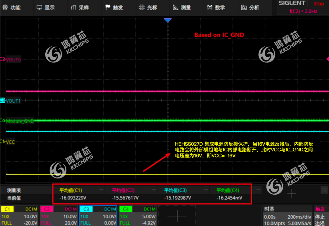 ▷电源16V供电,反接于VCC-Module_GND(VCC=0V,Module_GND=16V),观察基于IC_GND的波形,包括VCC,VOUT0,VOUT1,Module_GND