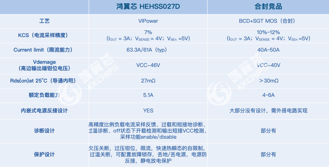 鸿翼芯独家采用意法半导体VIPower M-07先进垂直工艺,推出业界领先的单晶圆集成方案(非合封多die晶圆解决方案),车规级27mΩ智能高边驱动芯片HEHSS027D,实现完全Pin to Pin对标德国供应商主流高边驱动芯片,且满足同样的软件策略(仅调整部分阈值)。