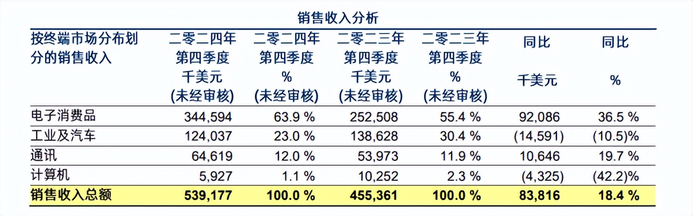 体现在产品终端需求结构上,第四季度电子消费品仍是其第一大终端市场,贡献了超6成营收,同比增长36.5%;但同期工业及汽车产品、计算机产品销售收入分别同比下降10.5%、42.2%。