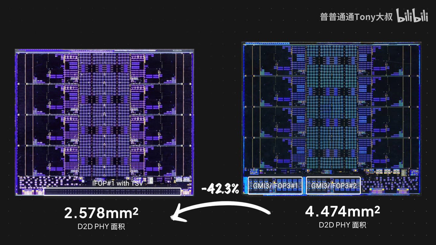 不过,AMD 调整了 CCD 的边缘 I/O,由基于 SerDes 的互联改为了水平扇出封装,这意味着 "Strix Halo" 所用 CCD 在纵向上缩短了 0.34mm,互联区域面积缩小了 42.3%。