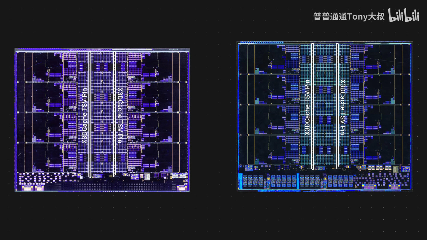 其中在 CCD 部分,AMD 大体上复用了桌面端锐龙 9000 "Granite Ridge" 处理器的 CCD 核心区域 IP 设计,因此 "Strix Halo" 芯片保留了用于 3D V-Cache 集成的 TSV 接口引脚。