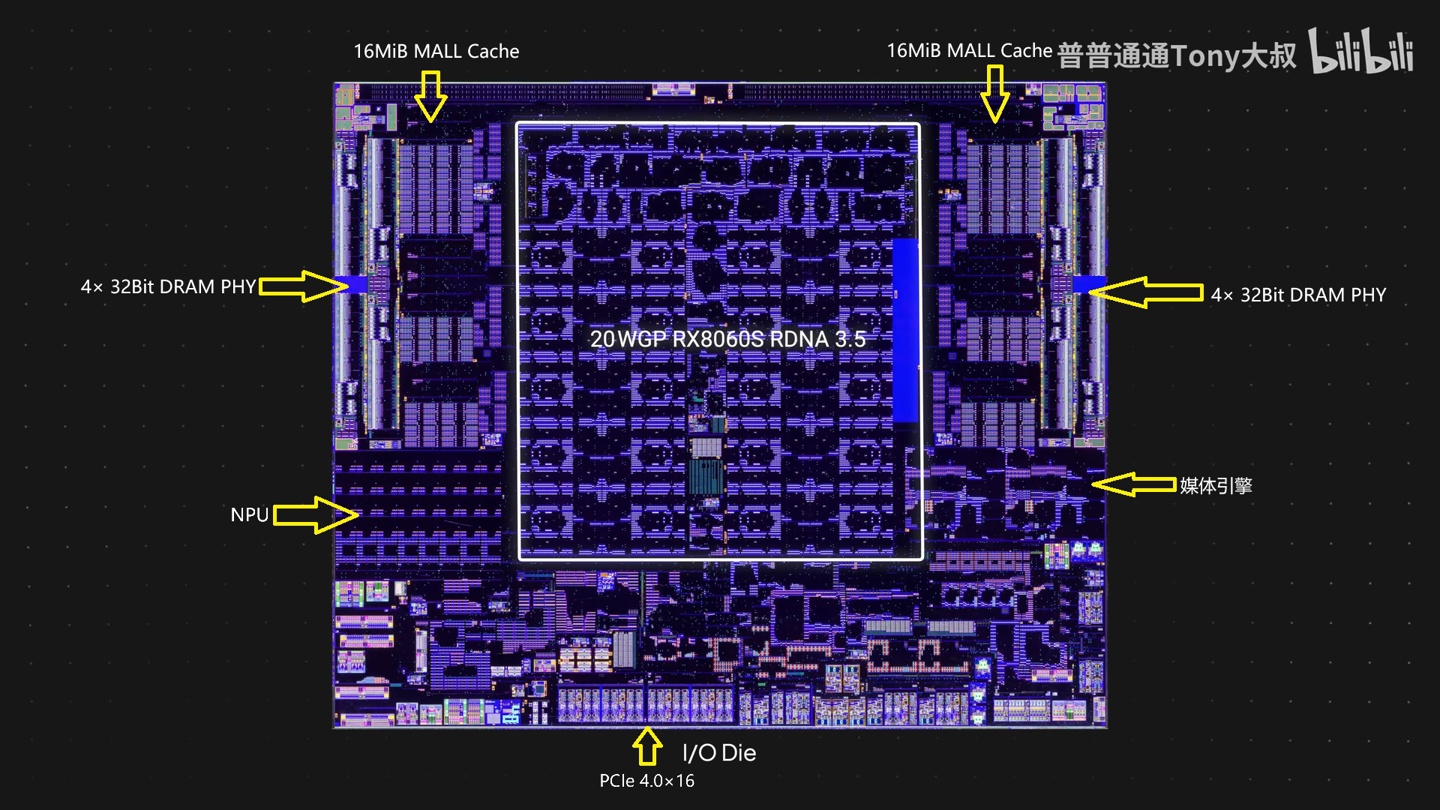 而在 IOD 部分,其中间区域自然是分为两簇的大型 RDNA 3.5 核显,左右稍微靠外部分则是两片 16MiB 的 MALL Cache(IT之家注:即 Infinity Cache),来到边缘位置则是一共 8 组、合计 256bit 的 DRAM 内存接口。