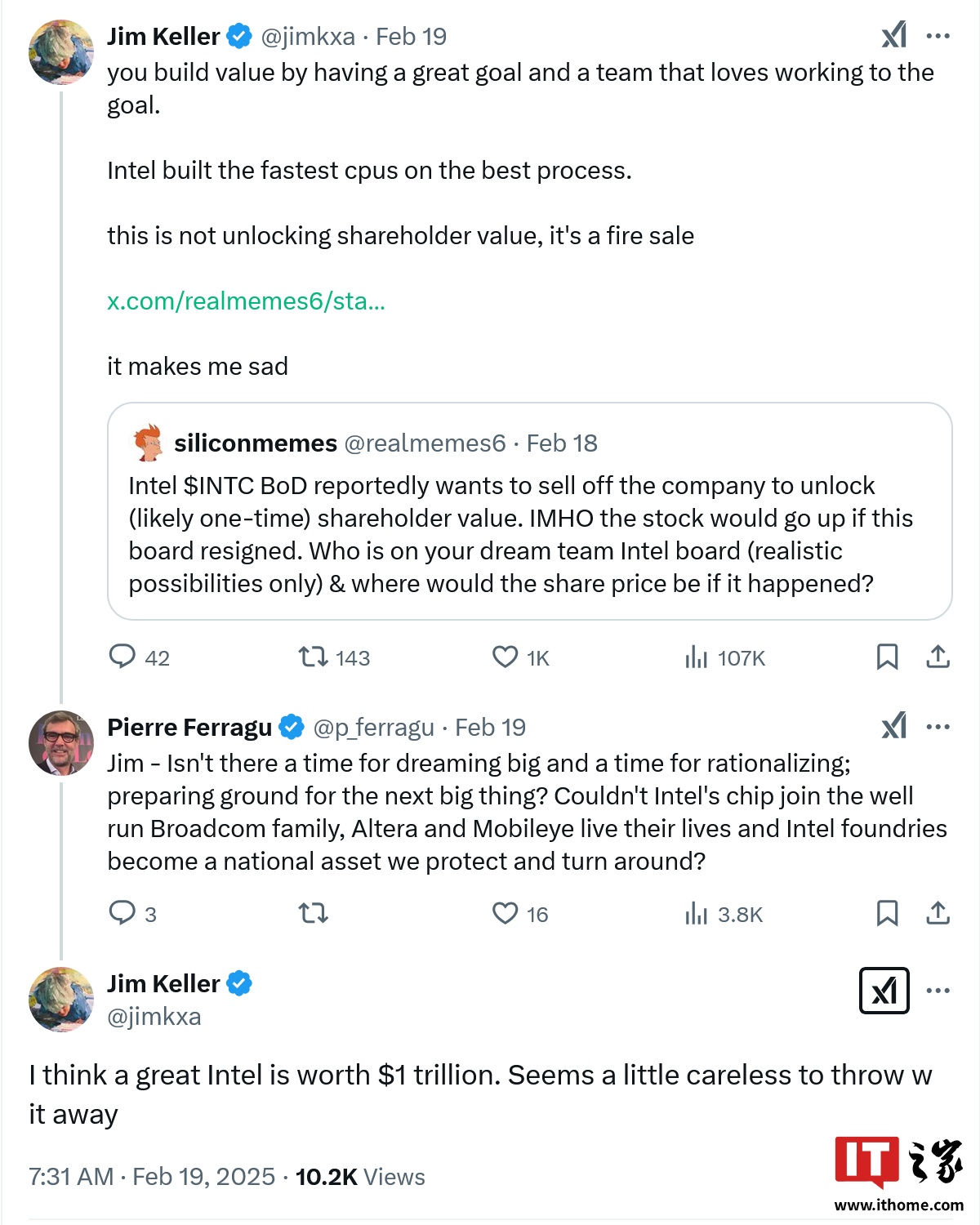 IT之家 2 月 20 日消息,著名芯片设计师、前英特尔高管吉姆・凯勒(Jim Keller)在 X 平台回复有关英特尔董事会希望出售公司的传闻时表示,这一信息让他个人很难过。