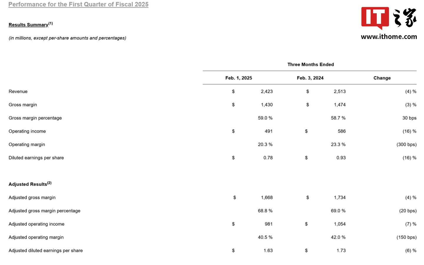 而在财务数据方面,ADI 2025 财年第一财季实现 24.23 亿美元营收,同比下滑 3.58%,环比略降 0.82%;第一财季该企业 Non-GAAP 毛利率为 59.0%,同比提升 0.3 个百分点,环比提升 1 个百分点。