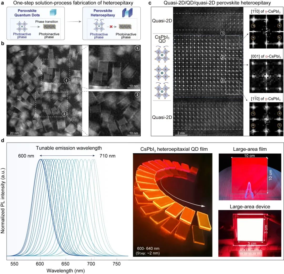 团队针对新型钙钛矿超高清显示技术中纯红光 CsPbI3 钙钛矿量子点材料相稳定性差这一世界难题,率先提出“外延异质结界面应力操控”策略,首次利用全溶液法实现钙钛矿范德华外延异质结的大面积原位可控制备,成功突破材料稳定性与器件性能双重瓶颈,研发出高效率与高稳定性兼备的纯红光钙钛矿电致发光器件 (LED),为下一代超高清显示技术发展提供了关键技术支撑,标志着在该领域的重大技术突破。