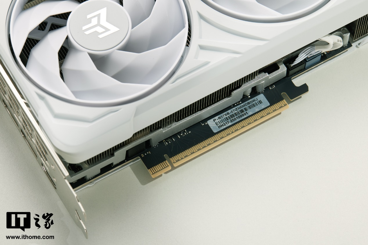 显卡另一侧还能看到置于金手指上方的一条显卡强化支架,金手指采用了全新的 PCIe 5.0 规格。