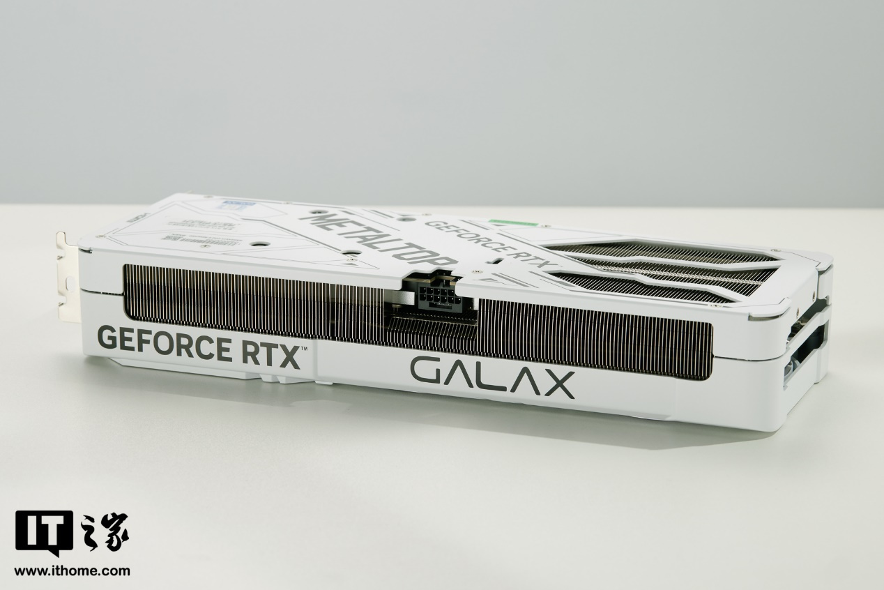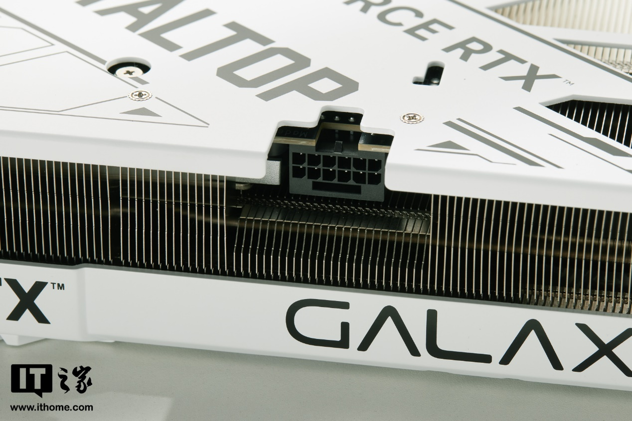 显卡的一侧做了半包裹设计,包裹部分的金属外壳印有 GEFORCE RTX 和 GALAX 的标志,上方露出内部密集的散热鳍片,居中位置是 12V-2*6 的显卡供电接口,而且是反扣式设计 + 独立背板开槽,方便用户拔插。