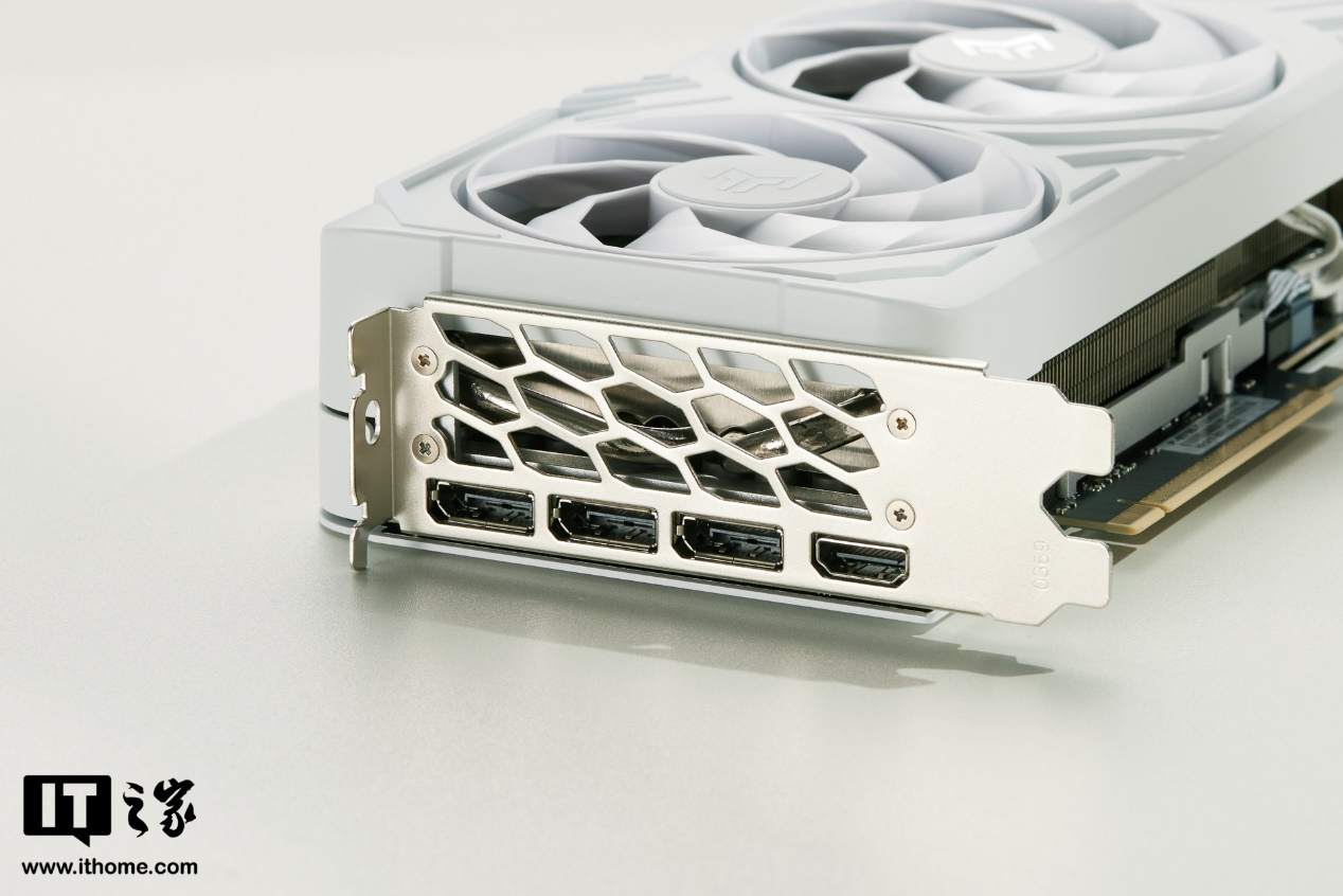 I/O 接口面板还是一如既往的影驰风格,设计了 3 组不规则的“鳞片”开孔,接口规格则是 3 个 DP2.1b 接口 + 1 个 HDMI2.1b 接口。