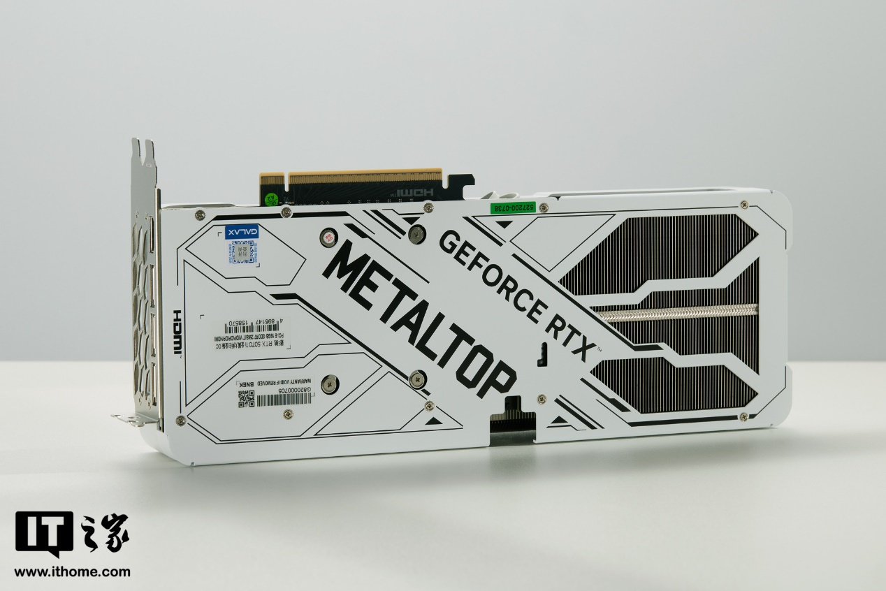 而在显卡背板的设计上,影驰 GeForce RTX 5070 Ti 金属大师白金版 OC 显卡在中间位置印上了全大写的 METALTOP 标志和 GEFORCE RTX Logo。其中 METALTOP 标志代表了影驰对于金属工艺的追求。除此之外,显卡背板上还印有大面积类似电路板的黑色线条,进一步凸显了科技感。最左侧影驰特意标出了 I/O 接口面板对应的 HDMI 接口位置,方便用户盲插,细节比较用心。