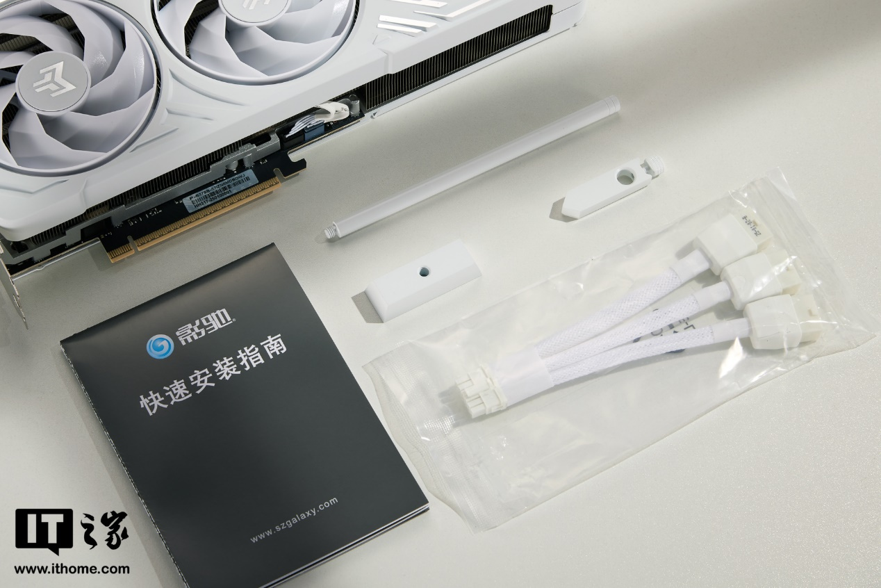 既然是白金版,配件自然也是统一标配了白色,包含一根 12v-2x6 转 3*8pin 的编制线材转接线,一套可拆卸的金属显卡支架。