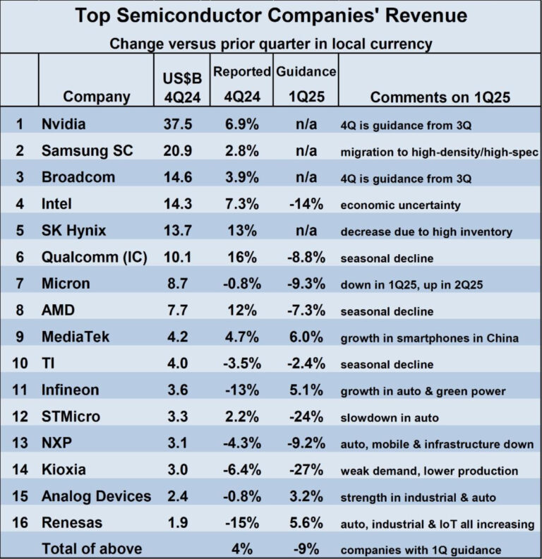 对于2025年第一季度收入的预测,大多数公司预计将比2024年第四季度有所下降。联发科、英飞凌、亚德诺半导体和瑞萨预计将实现低至中个位数增长。其他八家提供预测的公司预计将出现下降,范围从德州仪器的-2.4%到铠侠的-27%。导致下降的因素包括季节性、库存过剩、需求疲软、产量下降和经济不确定性。根据十二家提供预测的公司数据,2025年第一季度与2024年第四季度相比的加权平均收入变化为下降9%。
