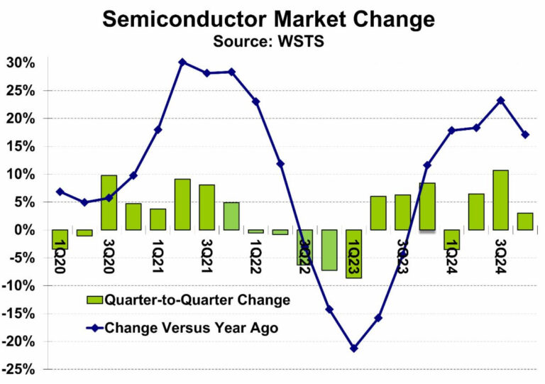 WSTS(世界半导体贸易统计协会)报告称,2024年第四季度全球半导体市场为1709亿美元,同比增长17%,较2024年第三季度环比增长3%。2024年全年市场为6280亿美元,比2023年增长19.1%。