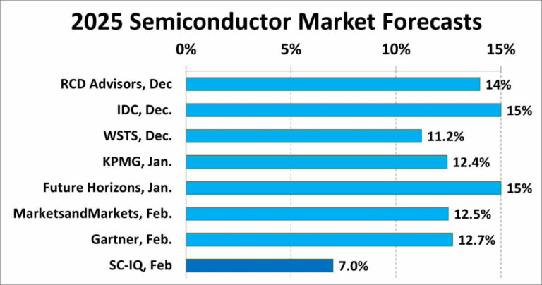 鉴于今年预计开局缓慢,2025年全年半导体市场的前景如何?过去三个月发布的预测范围从我们的Semiconductor Intelligence预测的7.0%到IDC和Future Horizons预测的15%。7%的预测是一个异常值,其他预测在11%到15%之间。