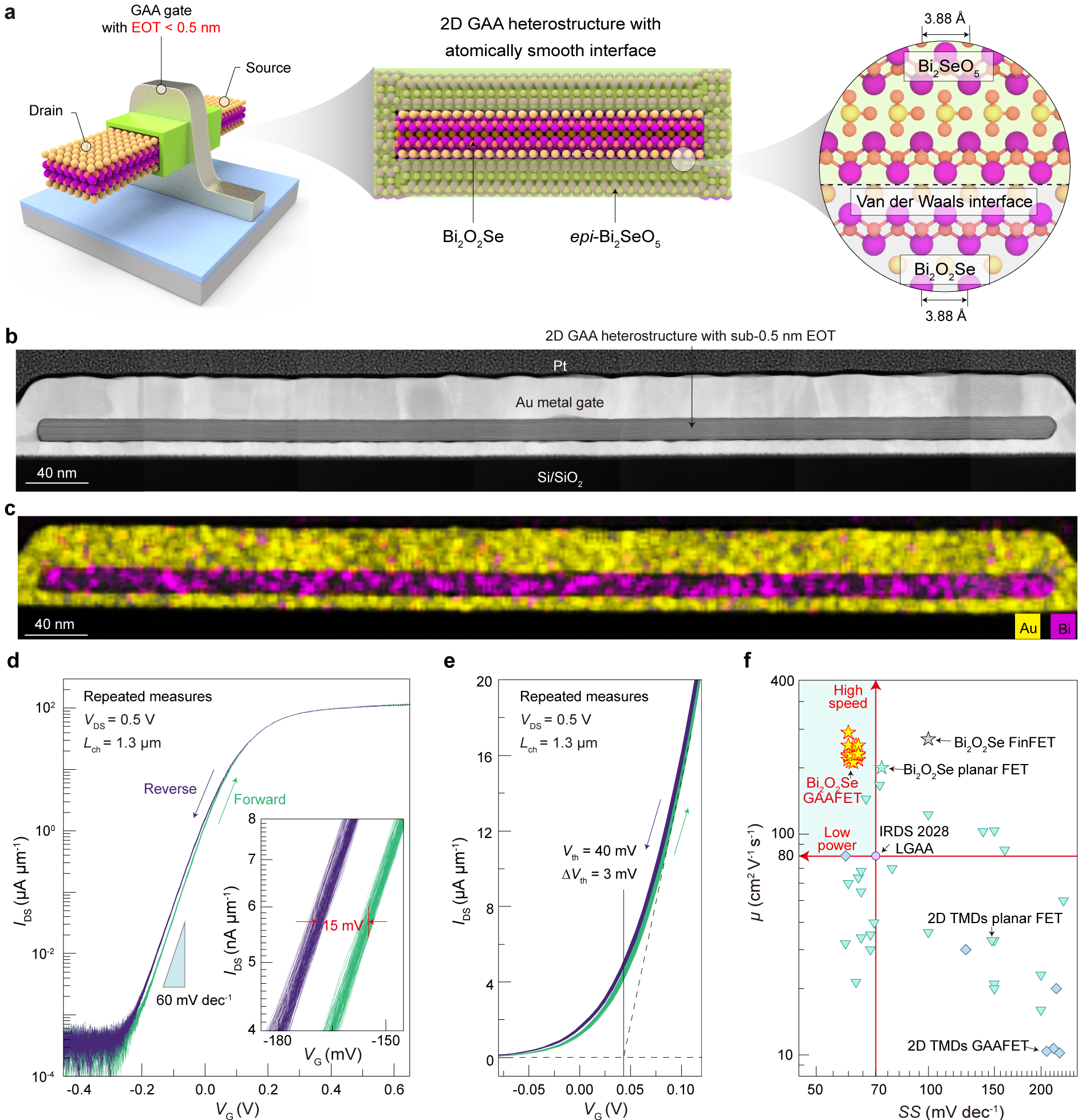 图3. 二维铋基环栅晶体管的电学特性。(a—c):二维铋基环栅晶体管的示意图(a)、截面透射表征(b)和元素分析(c);(d,e)二维铋基环栅晶体管的转移特性曲线与可靠性;(f)与其它二维晶体管对比