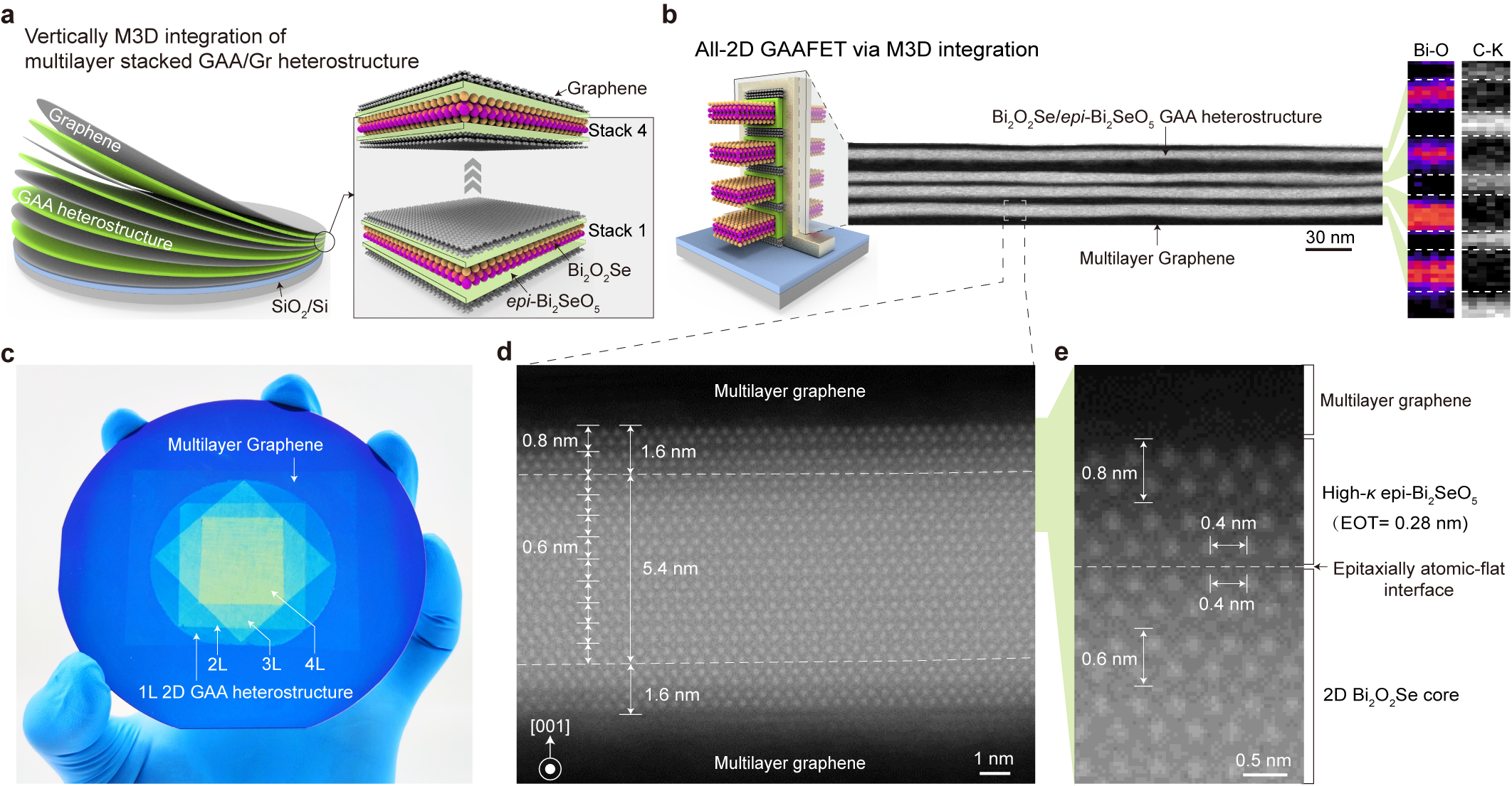 图2. 二维Bi2O2Se/Bi2SeO5环栅外延异质结与三维异质集成。(a—c):晶圆级多叠层二维铋基环栅异质结的示意图(a)、截面透射表征与元素分析(b)和光学照片(c);二维铋基环栅晶体管的原子级平整界面(d,e)