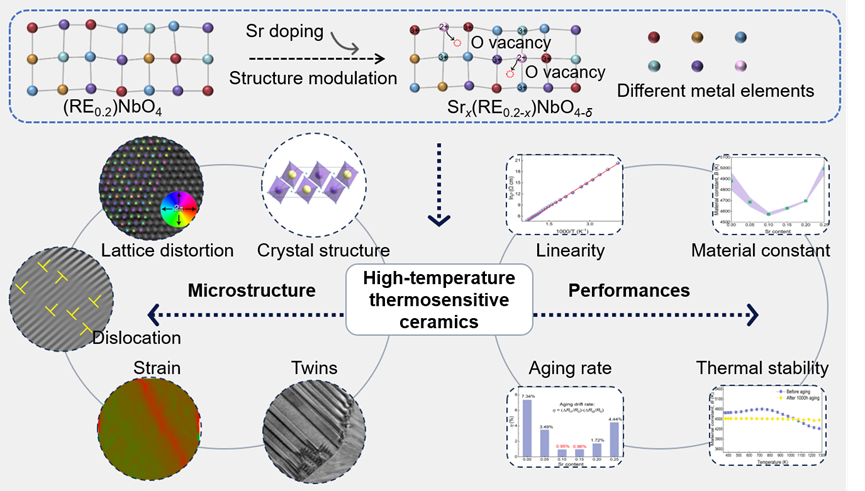 中国科学院新疆理化技术研究所科研人员基于氧空位调控机制,开发出具有褐钇铌矿结构的稀土铌酸盐(RENbO4,RE为稀土元素)高熵热敏陶瓷材料,创新性地提出熵工程协同异价取代策略。该策略通过多元稀土离子A位引入导致的熵稳定效应与Sr2+异价掺杂的协同作用,提升了氧空位浓度,优化了材料的电子传输特性和晶格稳定性。研究显示,氧空位诱导的熵稳定机制可同步调控材料微结构,形成孪晶畴、晶格畸变与动态重构等稳定特征,强化了温度-电阻响应的线性度和高温服役稳定性。