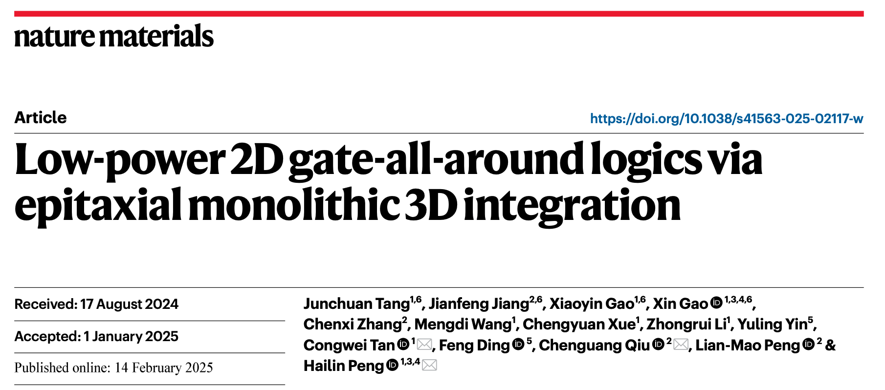 2025年2月14日,北京大学化学与分子工程学院彭海琳教授研究团队与北京大学电子学院邱晨光研究员团队在《自然-材料》(Nature Materials)在线发表题为“Low-power 2D gate-all-around logics via epitaxial monolithic 3D integration”的研究论文,报道了世界首例低功耗二维环栅晶体管(2D GAAFET),并研制出高性能低功耗二维环栅逻辑器件。
