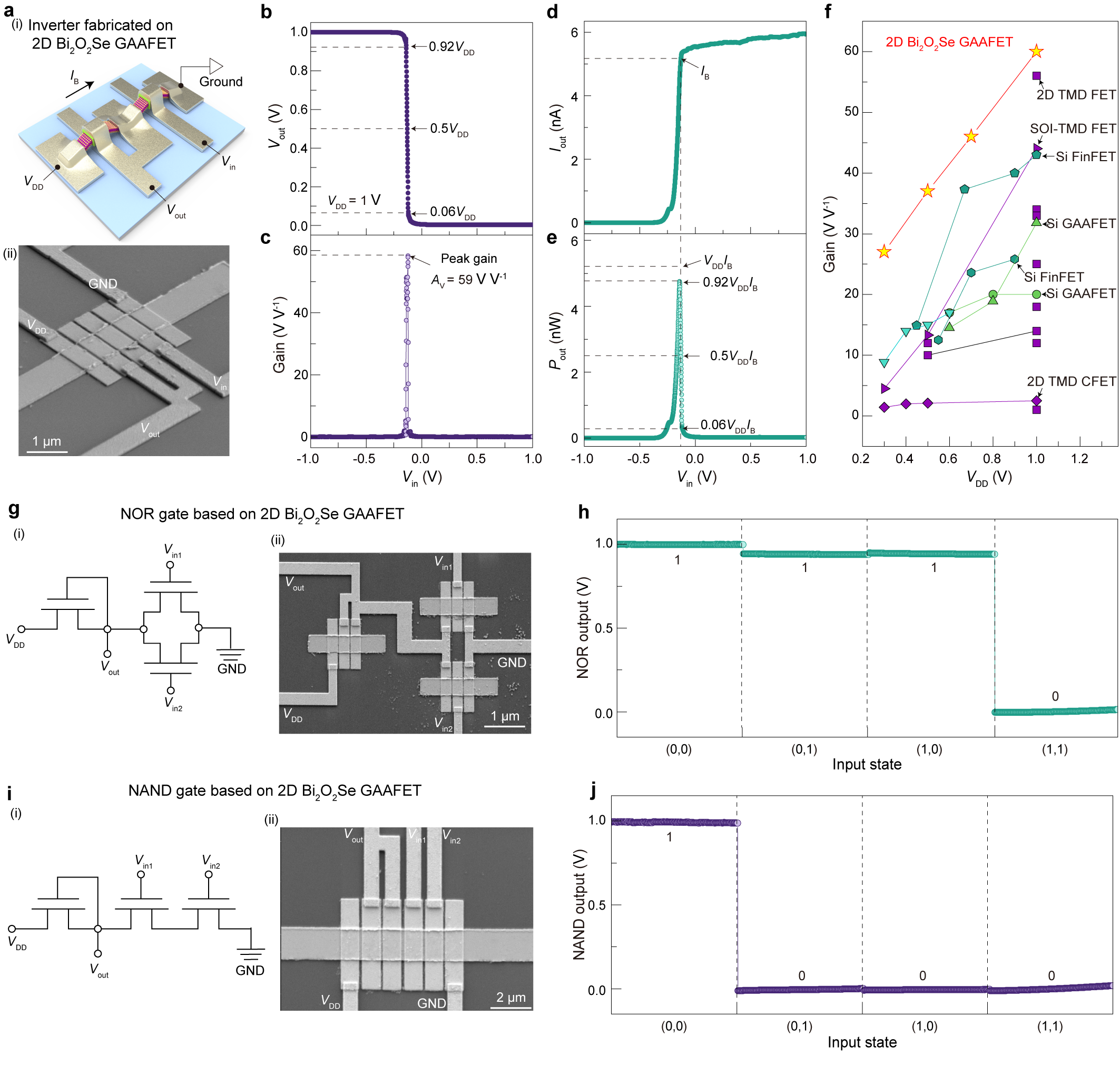 图5. 二维铋基环栅逻辑单元。二维铋基环栅非门示意图(a),工作曲线(b,c)、功耗(d,e)及增益对比(f);二维铋基环栅或非门(g,h),与非门(i,j)的结构表征与功能