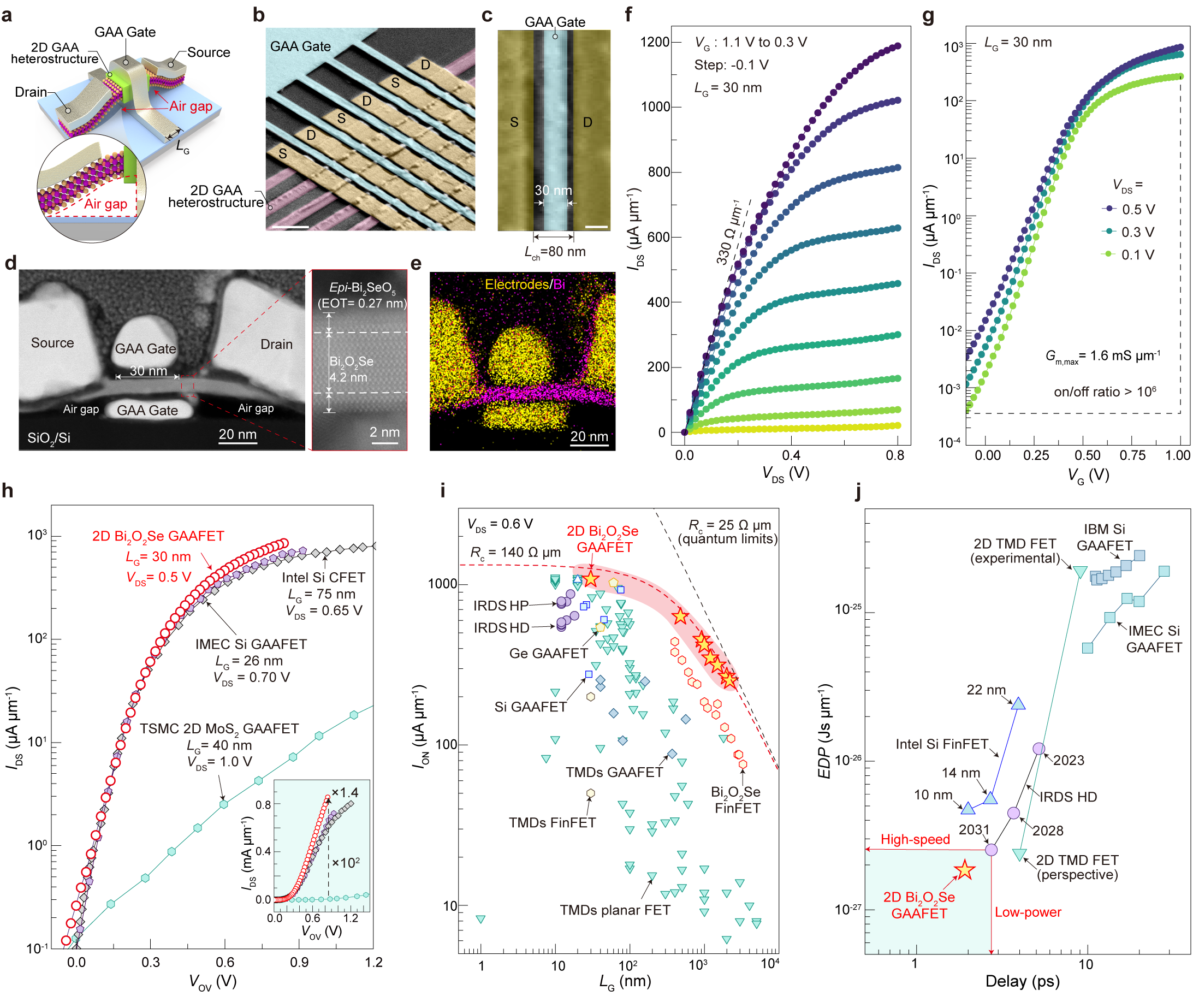 图4. 二维铋基环栅晶体管的电学性质。二维铋基环栅异晶体管的示意图(a)、扫描电镜图(b,c)、截面透射电镜图(d)和元素分析(e);晶体管的输出(f)和转移(g)特性及性能(h,i)与能效(j)的客观对标