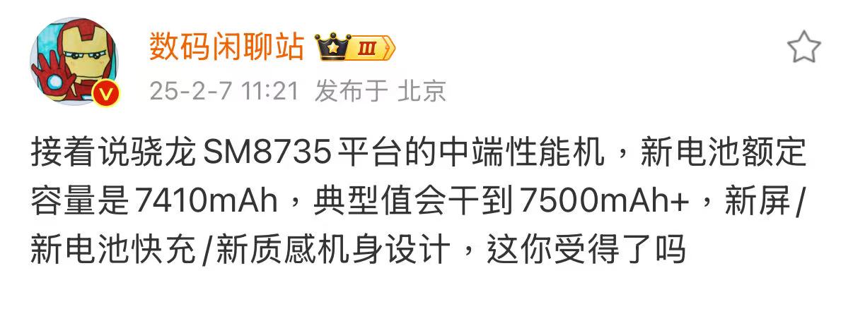 不过,就目前已曝光首批搭载骁龙8s Elite移动平台的机型来看,应该会是主打超长续航的机型偏多。在数码闲聊站的爆料中,就连小米Civi5 Pro都上了6000毫安时的大电池,更别提还有一款7500毫安时的机型正在测试中了。