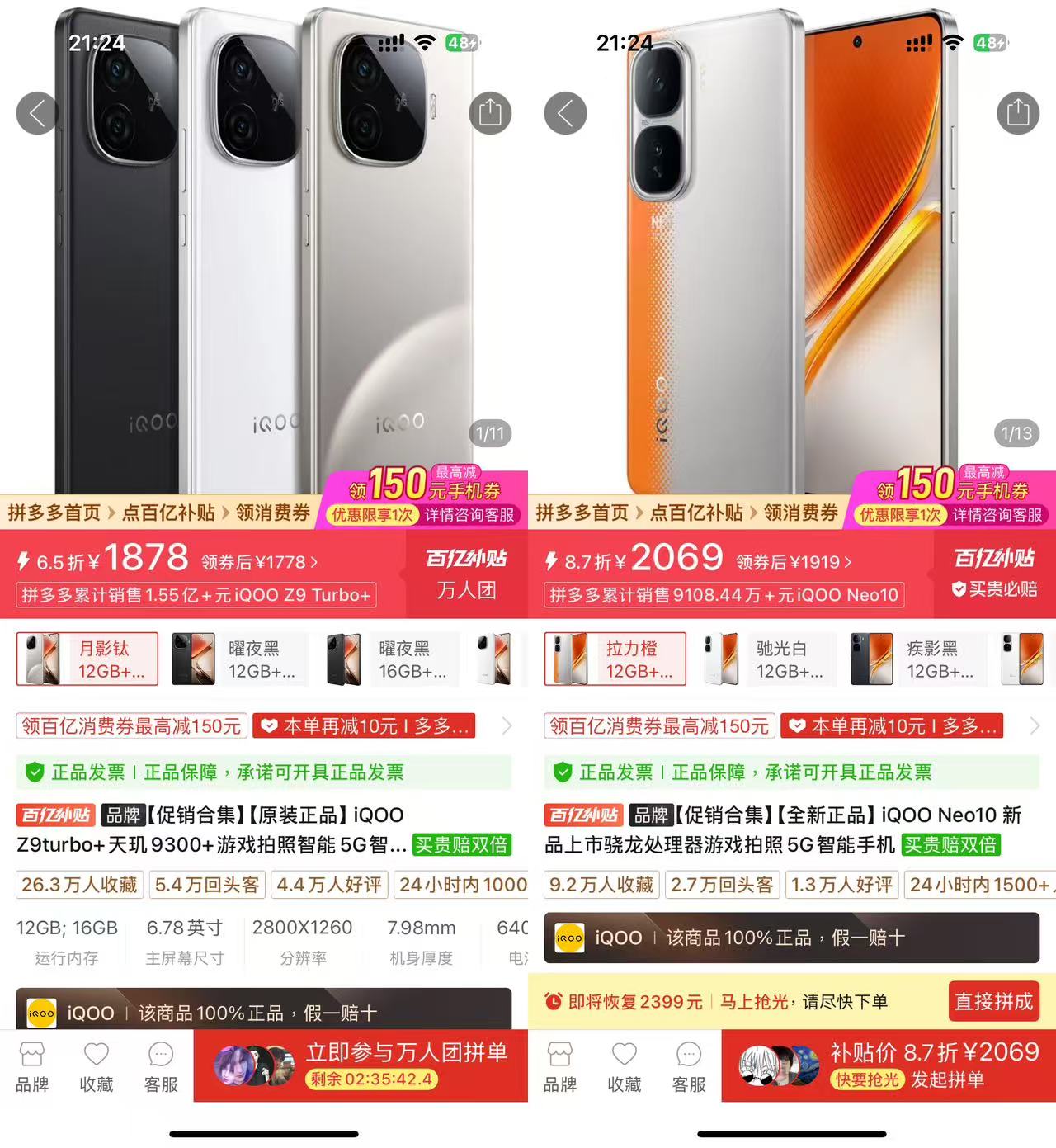 尤其是在百亿补贴与国补的双重优惠政策下,搭载旧款旗舰芯片的中端机型优势反而更为明显。搭载骁龙8 Gen 3的iQOO Neo 10如今只需2069元起、搭载天玑9400+的iQOO Z9 Turbo也只要1878元起。在这些旧旗舰芯片的冲击下,骁龙8s Elite的新机似乎需要抛出更大的优惠,或是更具吸引力的其他特性。